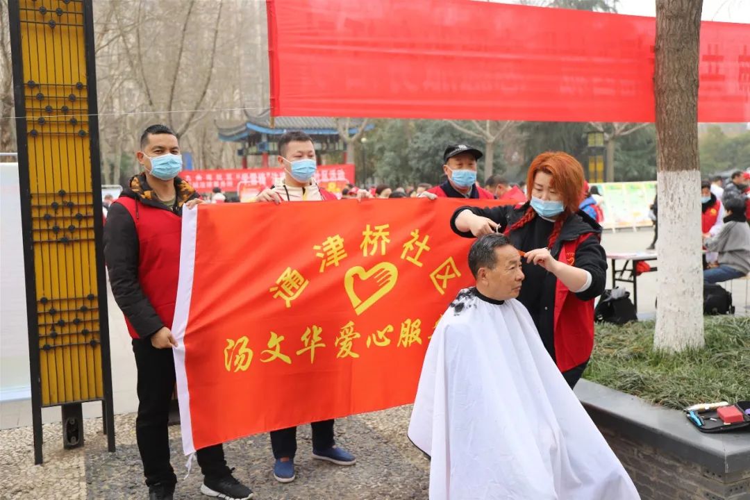 在另一侧,政策宣传台也吸引群众驻足,志愿者耐心地解答群众问题,并为他们进行免费的推拿、理发服务。