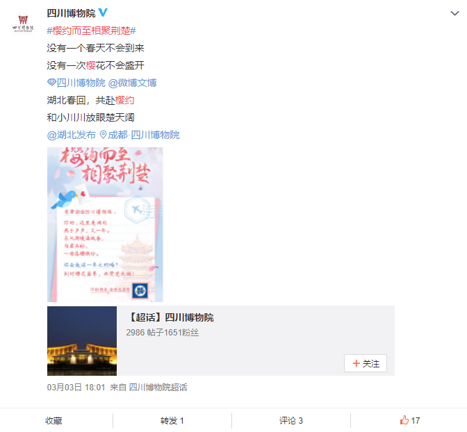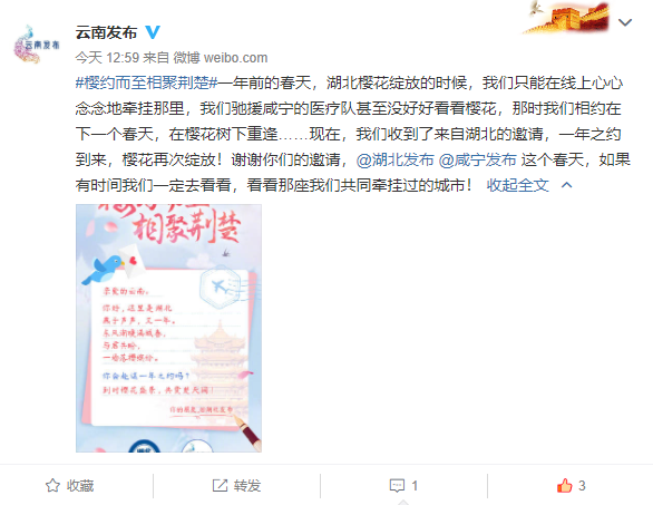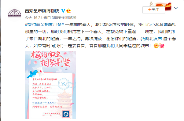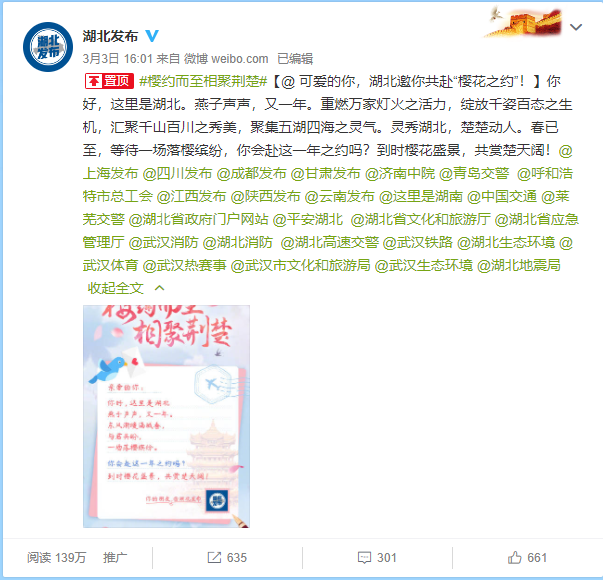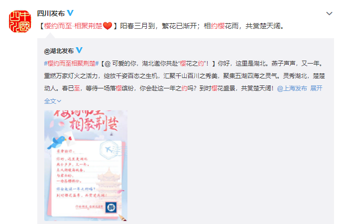 发布会结束后,湖北发布第一时间通过微博邀约海报,请全国人民共赴这场“樱花之约”。