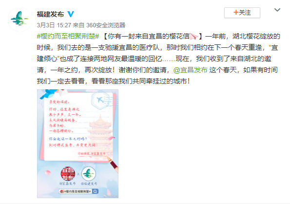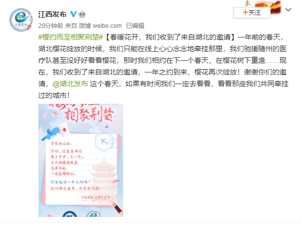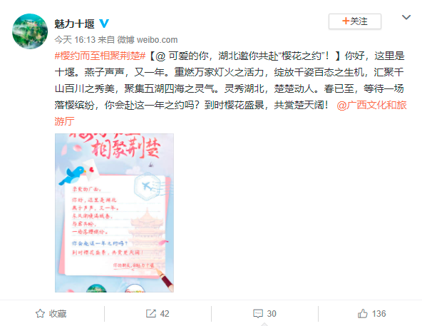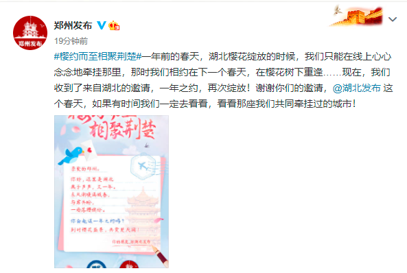 随后,武汉、襄阳、宜昌、荆州等17个地市州官方微博也陆续发布邀约海报。