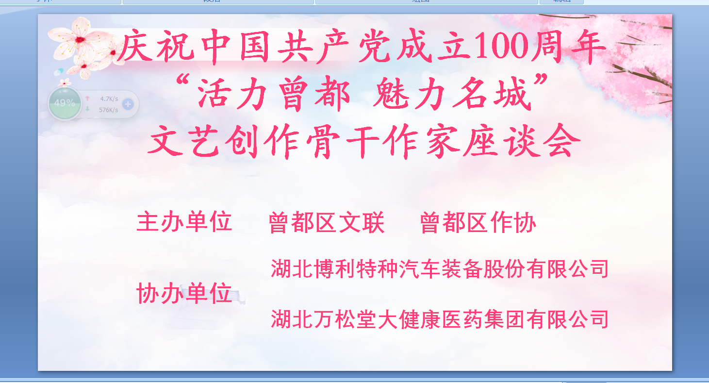 3月5日,曾都区作协召开庆祝中国共产党成立100周年“活力曾都·魅力名城”系列文艺创作活动骨干作家座谈会,座谈会由曾都区委宣传部副部长、区文联主席王合意主持。曾都区委常委、宣传部部长刘永华出席会议。