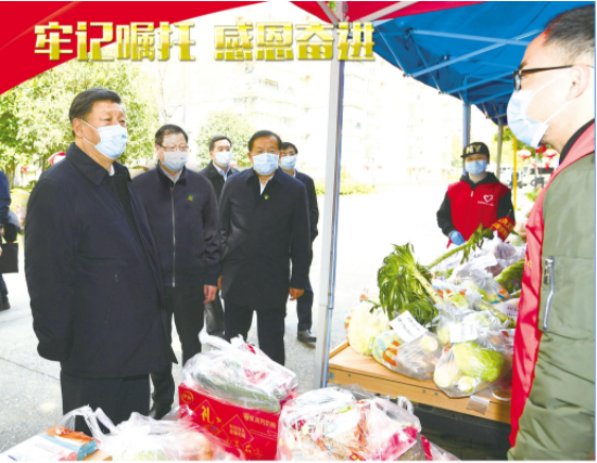 上图:2020年3月10日,习近平总书记在东湖新城社区生活物资集中配送点,详细询问社区群众生活物资采购和供应情况。 (新华社发)