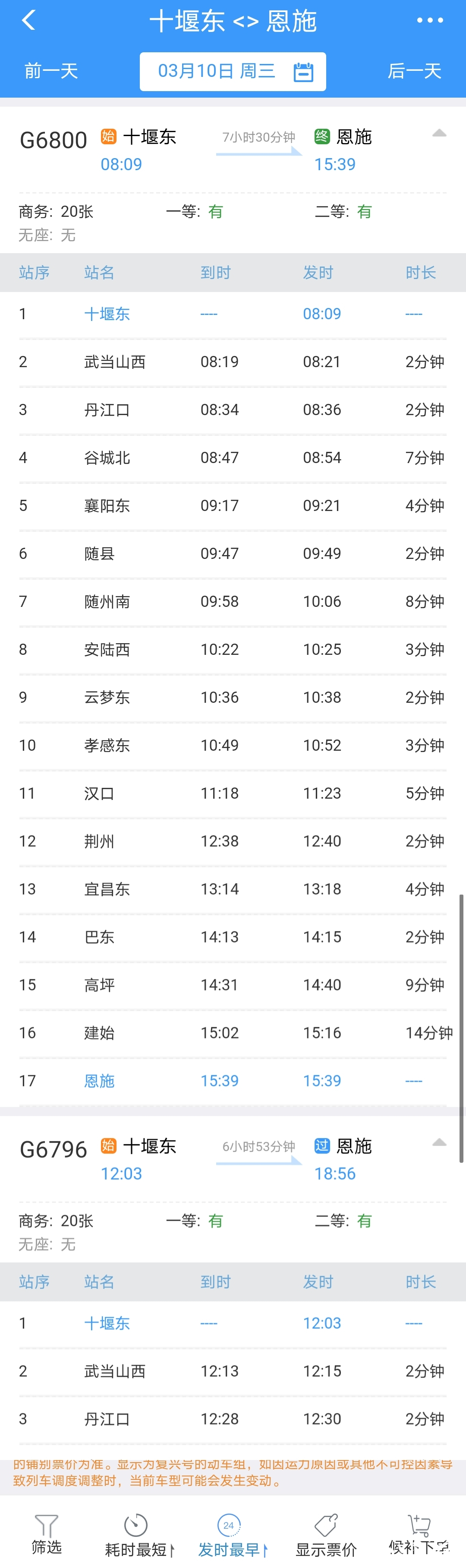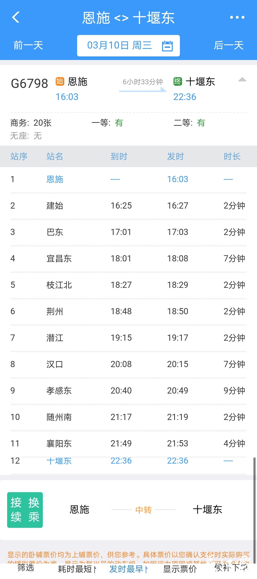 恩施至十堰东G6798次,恩施站16:03始发,沿途停靠建始、巴东、宜昌东、枝江北、荆州、潜江、汉口、孝感东、随州南、襄阳东等站,22:36终到十堰东。