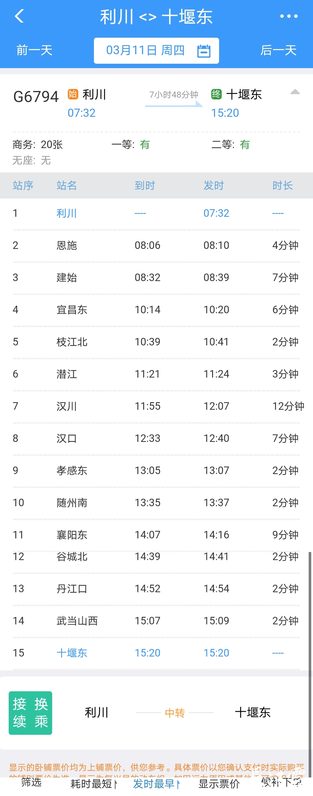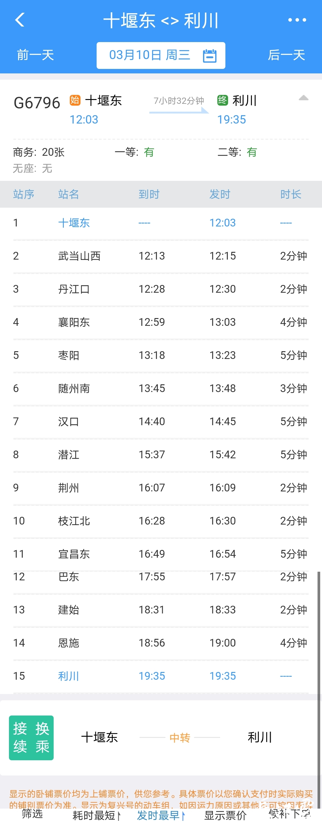 十堰东至利川G6796次,十堰东站12:03始发,沿途停靠武当山西、丹江口、襄阳东、随州南、汉口、潜江、荆州、枝江北、宜昌东、巴东、建始、恩施等站,19:35终到利川。