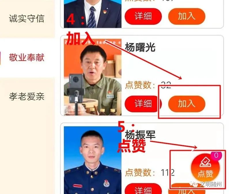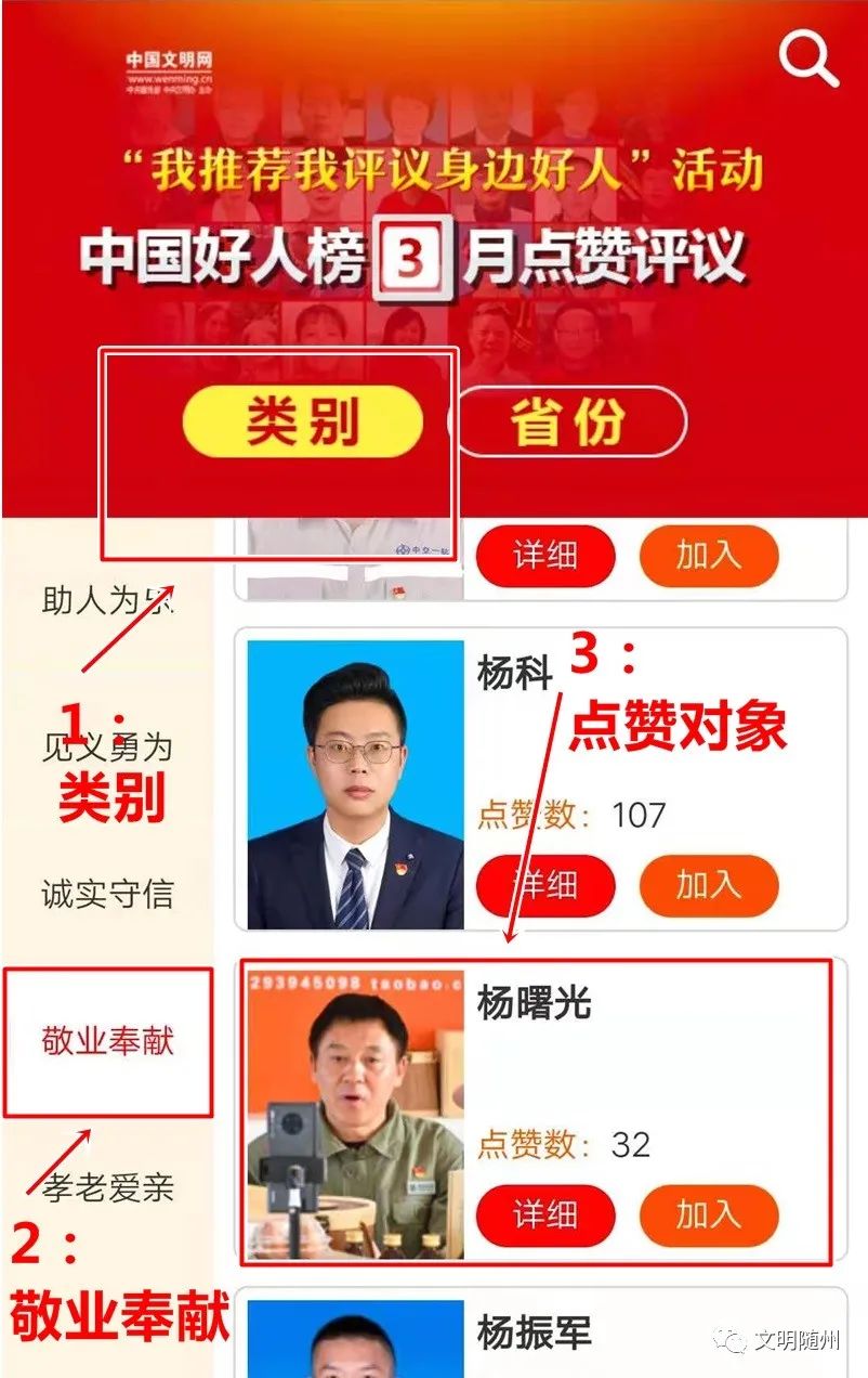 1:点击“类别”选项后,下滑选择“敬业奉献”,下滑找到被点赞人“杨曙光”,“加入”到点赞库;