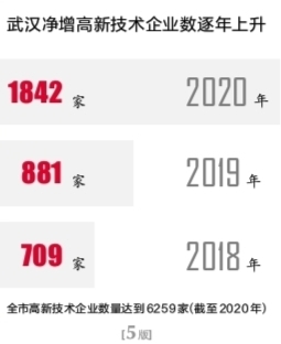 据悉,武汉市净增高新技术企业数逐年上升,2018年为709家,2019年为881家,2020年为1842家,实现历史性突破。截至2020年底,武汉高新技术企业总数为6259家。