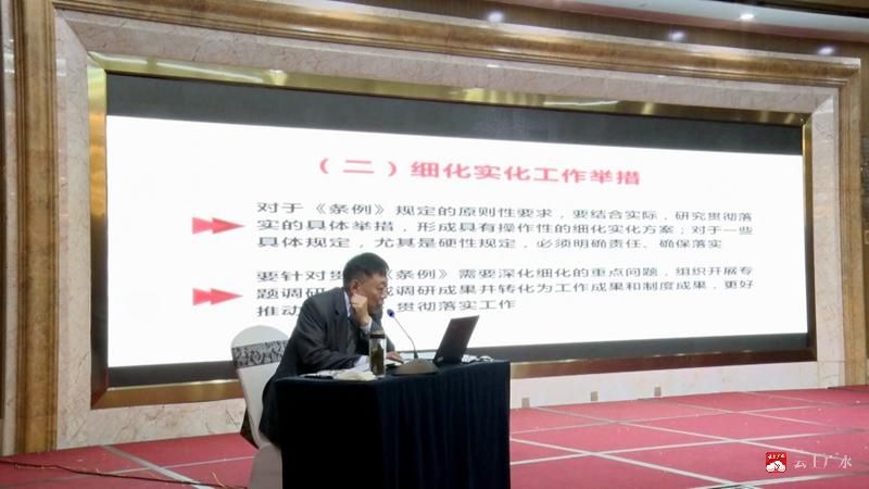 11号上午,在广水市委中心组集中学习(扩大)会暨市委统一战线工作领导小组会议上,罗鹰以《新时代统一战线工作的基本遵循》为题,围绕《条例》的修订背景、修订过程、重要意义、突出特点、总纲、主线、结构内容、贯彻实施等方面,对《条例》作了深入浅出的系统阐述和详细解读。