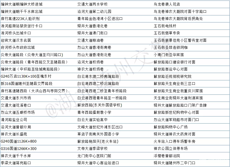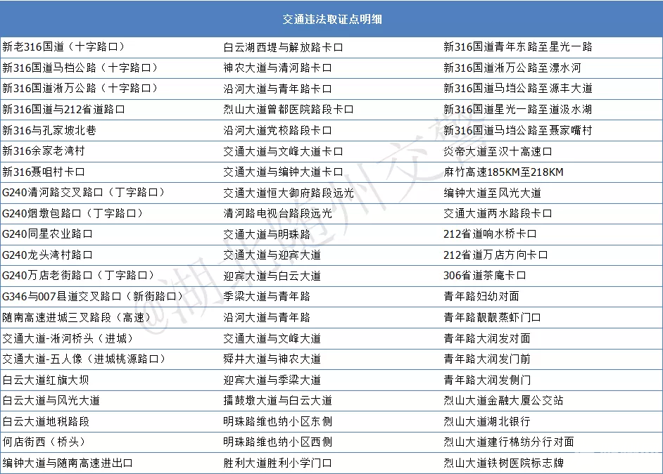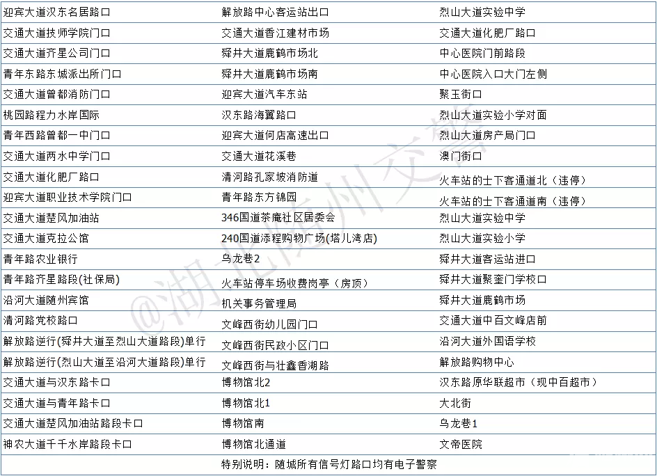 随州市智能交通系统已全面启动对各类道路交通安全违法行为电子自动抓拍取证,主要有驾驶机动车不按道路交通信号灯通行的;通过路口遇停止信号停在停车线以内或者路口内的;机动车通过灯控制路口时,不按所需行进方向驶入导向车道的;机动车逆向行驶的;机动车违反禁止标线指示的(压越中心实线、分道实线,黄色网状线等禁止标线);超速行驶的;驾驶人未按规定使用安全带的(新启动城区道路);驾驶时拨打接听手持电话的;驾车时有其他妨碍安全行车的行为的(吸烟、饮食、查阅手机等);机动车违反禁令标志指示的;机动车未按照规定期限进行安全技术检验的;驾驶摩托车时驾驶人未按规定戴安全头盔的;乘坐摩托车不戴安全头盔的;非机动车不按照交通信号规定通行的;行人违反交通信号通行的等,请广大交通参与者自觉遵守道路交通安全法律法规,安全驾驶,文明出行,确保道路交通安全、畅通、有序。