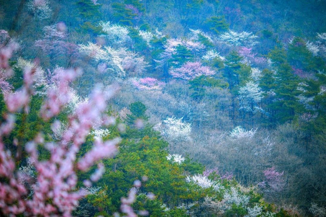洪山属野生山樱群落聚集区,生长多年的野樱花,尤以核心景区宝珠峰周围居多,数量达数十万株。每年3月开始,从山脚到山顶,不同海拔高度的樱花次第开放,一直持续到4月中旬。放眼望去,漫山遍野的樱花团团簇簇,如漫天飞舞的棉絮,也似朵朵漂浮的白云,蔚为壮观。