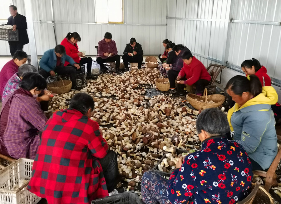 “采摘、清理、切片、烘干、装袋待售”。3月15日,随县高城镇财政所干部到罗家桥村了解扶贫产业基地——赤松茸菌种植专业合作社生产情况,看到社员们正有条不紊忙着采收菌菇。