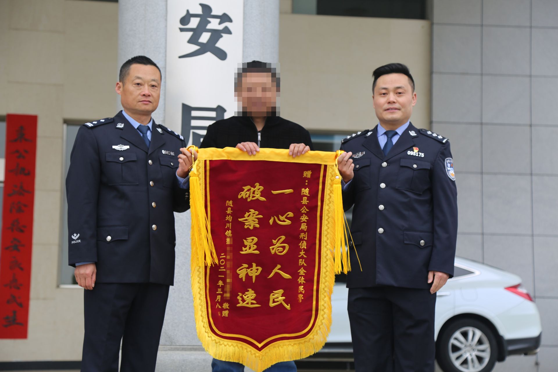 3月9日9时,随县均川镇村民梁某将印有“一心为人民 破案显神速”的锦旗送到刑侦大队民警手中,并表达了自己由衷的感谢。