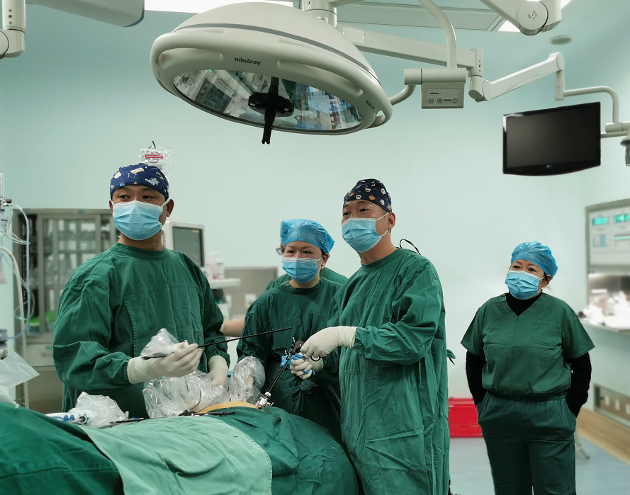 68岁的蒋女士因“腹痛伴停止排便10天”入院,CT提示:肠梗阻......因患者高龄,传统探查伤口创伤大,疼痛重,恢复慢。如果行腹腔镜手术创伤小、恢复快。经普外科、妇产科、泌尿外科等科会诊、讨论,拟决定给予腹腔镜微创手术。术中(镜下)见左侧子宫附件区可见约10cm*10cm囊实性肿块与直乙交界处直肠粘连致密,粘连处可见移位节育环。经过细致的分离,将直肠完整的与肿瘤及移位节育环分离切(取)除并植入输尿管支架管;术后转ICU重症监护治疗。经过精心护理,患者恢复良好,将于近日出院。