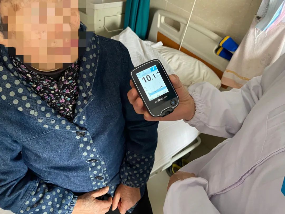 据了解,蒋大妈,81岁高龄,患糖尿病26年,诊断为II型糖尿病,胰岛功能极差,血糖波动大,治疗难度也大,通过用新引进的瞬感扫描式葡萄糖监测系统,只需使用扫描检测仪轻轻一扫传感器,即可获得葡萄糖读数,从而指导精准的调查胰岛素用量,让患者血糖控制达标。