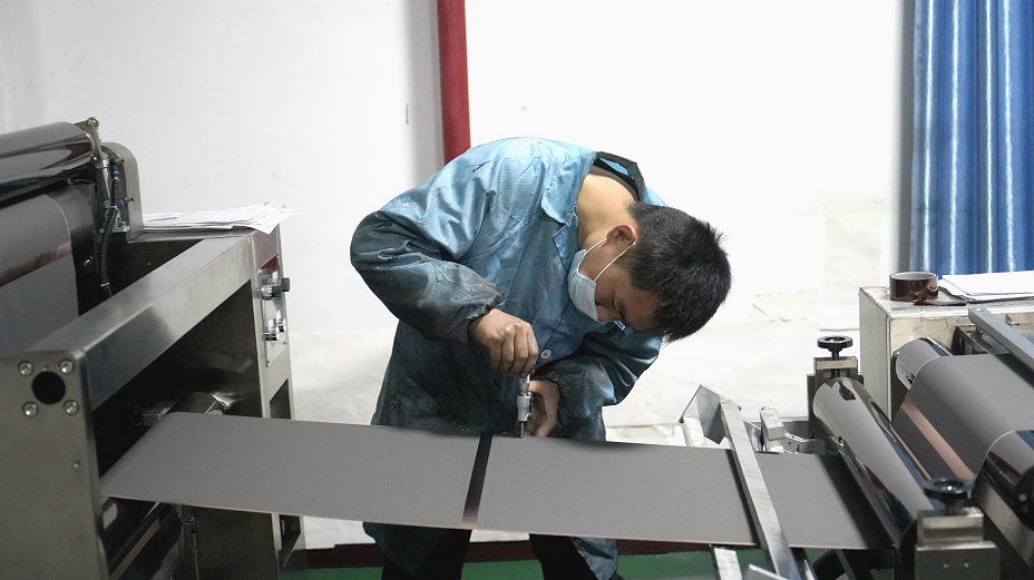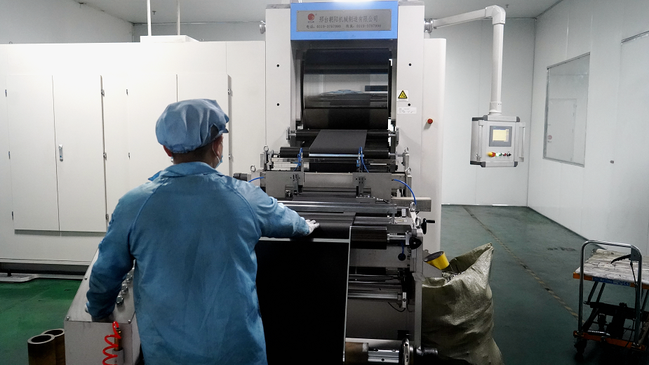 一旁正在用千分尺测量的身影引起了记者的注意。“烘干之后,还需要用千分尺测量极片面密度,保证正负误差不超过0.002毫米。”彭雷介绍到,0.002毫米这个数字让记者倍感惊奇,惊叹于这精益求精的“大国工匠”精神。