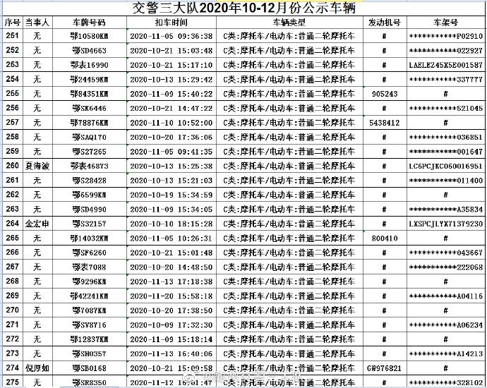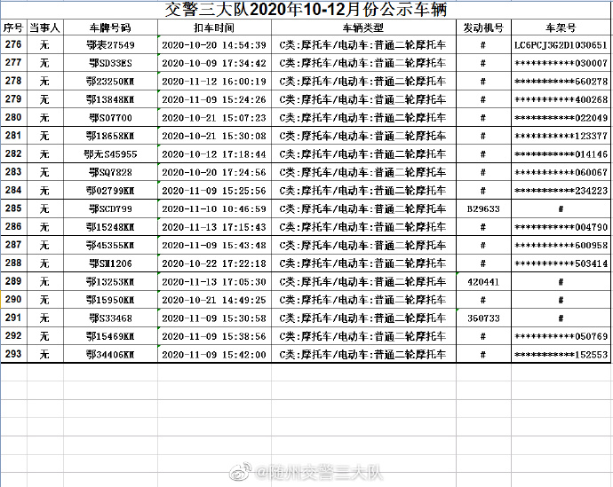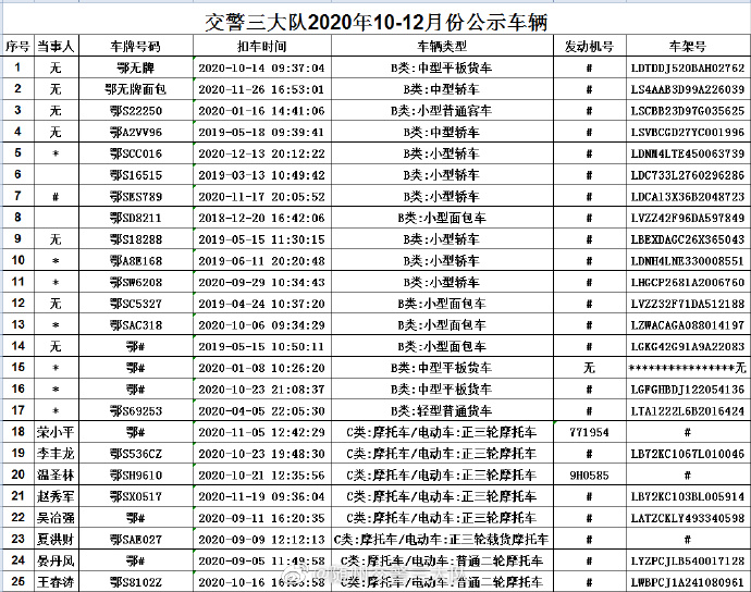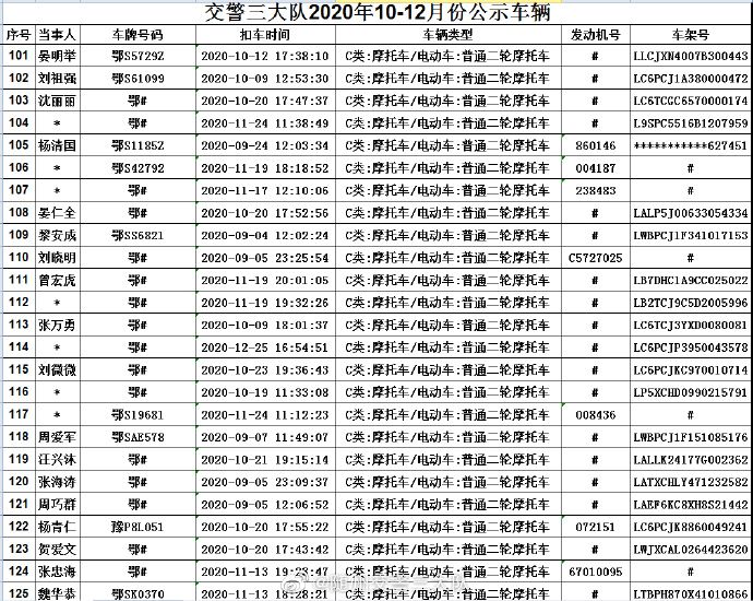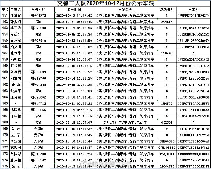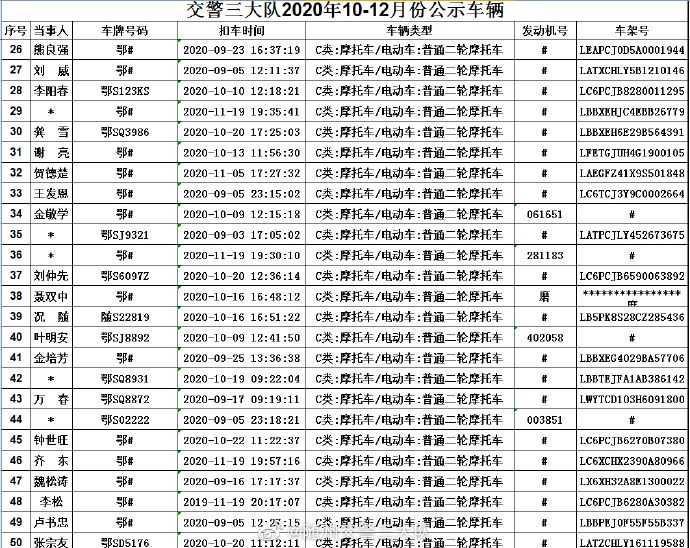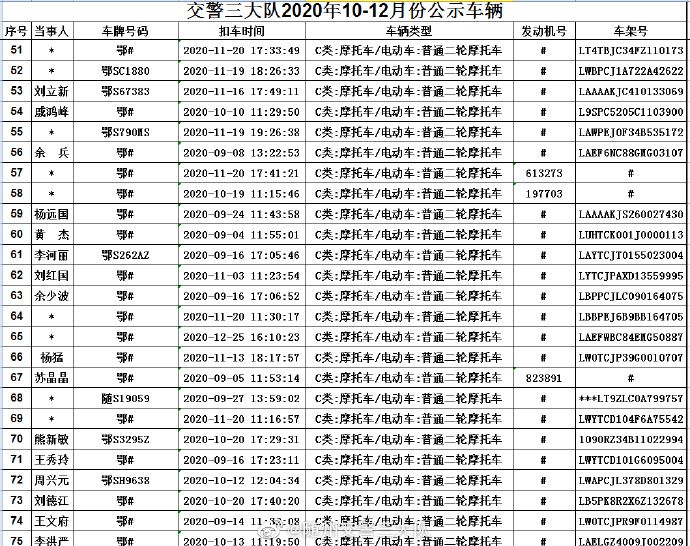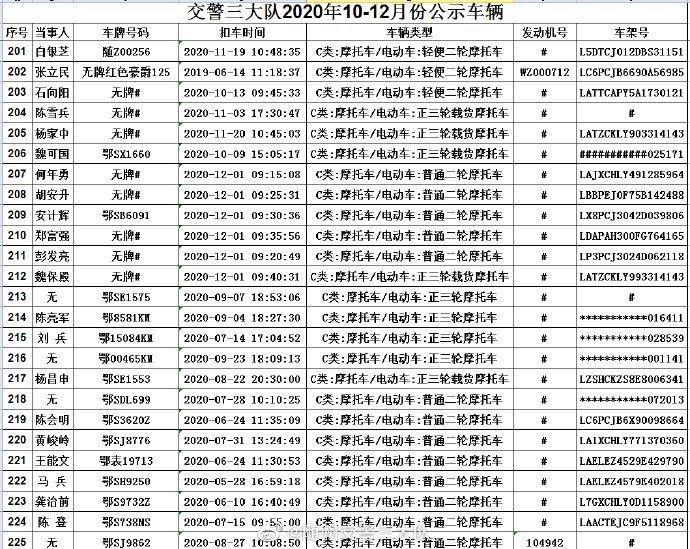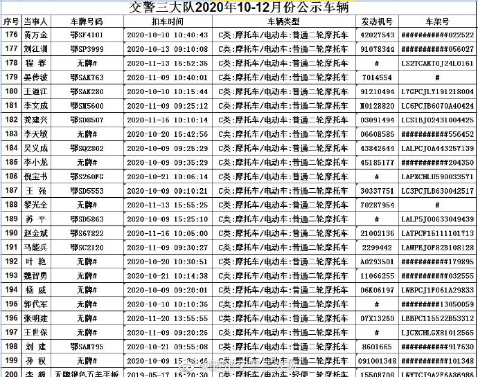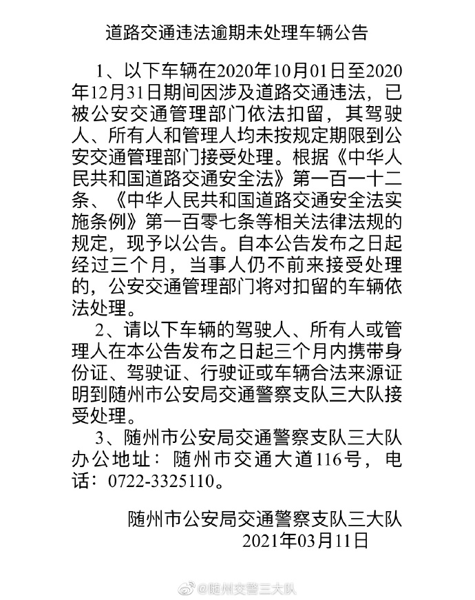 为加强重点车辆和驾驶人源头隐患清理,着力消除各类道路交通安全隐患,进一步深化“减量控大”工作,从源头预防道路交通事故的发生,随州交警三大队现对2020年10月01日至2020年12月31日逾期未处理待公告车辆予以曝光,请以下车辆的驾驶人、所有人或管理人在本公告发布之日起三个月携带身份证、驾驶证、行车证或车辆合法来源证明,到随州市公安局交通警察支队三大队接受处理。