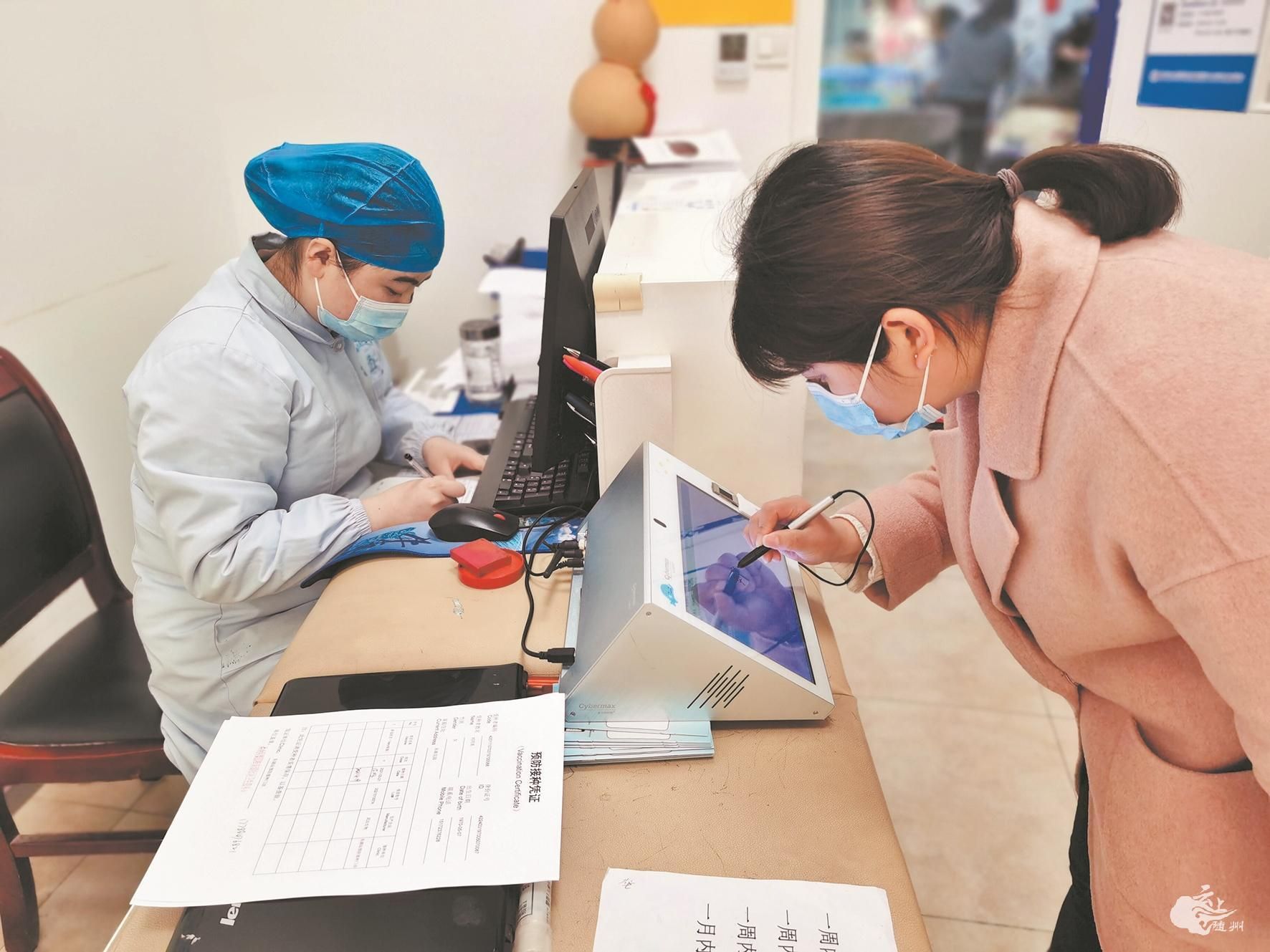 在东湖社区卫生服务站,接种市民确认接种信息