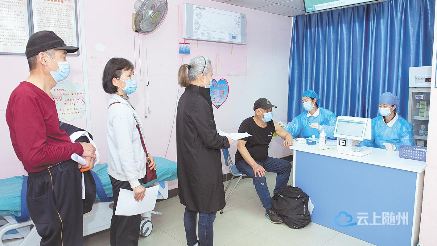 3月29日,武汉市青山区红钢城街社区卫生服务中心,医护人员正在为街道辖区内60岁以上老年人接种新冠疫苗。
