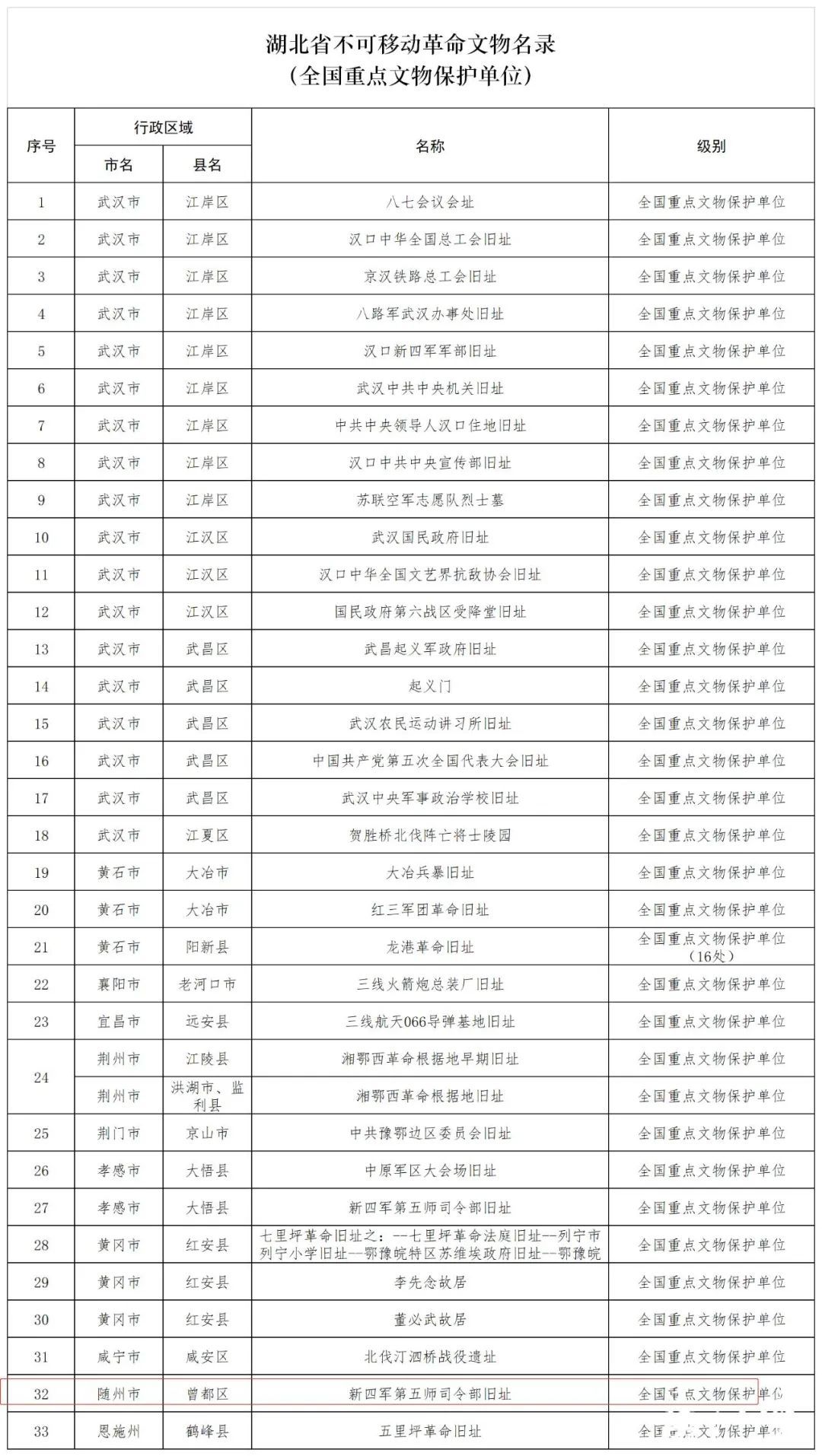 3月29日,湖北省文化和旅游厅核定公布了湖北省第一批革命文物名录,共有不可移动革命文物1018处、可移动革命文物2810件(套)。其中,不可移动革命文物包括全国重点文物保护单位33处,省级文物保护单位150处,市县级文物保护单位835处;可移动革命文物包括一级文物143件(套),二级文物367件(套),三级文物2300件(套)。