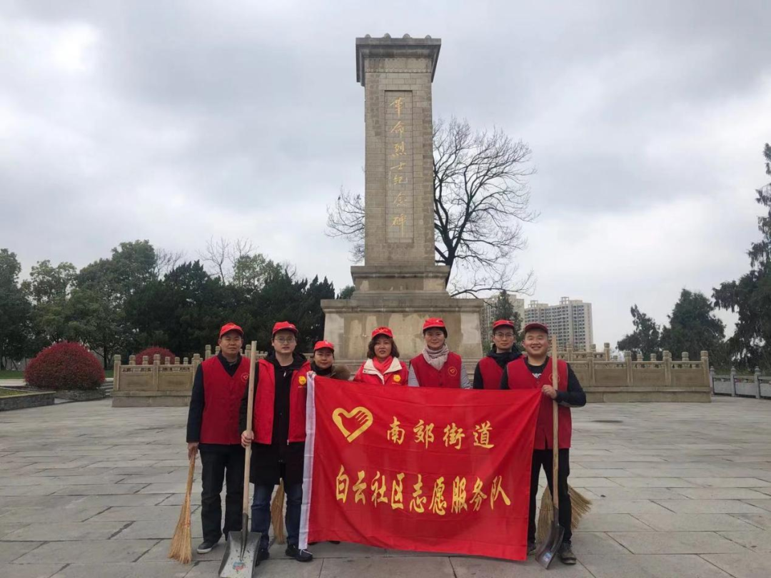 清明节前夕,南郊街道白云社区联合下沉党员到随州市烈士陵园开展“清洁烈士陵园”志愿服务活动。(包璇)