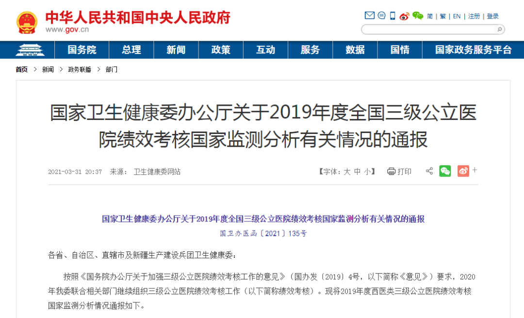 据悉,此次考核是由国家卫生健康委三级公立医院绩效考核领导小组办公室组建的由卫生健康行政部门、三级公立医院、高等院校、科研机构等相关专家构成的评价团队,在2018年绩效考核经验的基础上,对全国三级公立医院从医疗质量、运营效率、持续发展、满意度评价4个维度56项监测指标数据开展监测分析,引导三级公立医院进一步落实功能定位,提高医疗服务质量和效率,推进分级诊疗制度建设,为人民群众提供高质量的医疗服务。