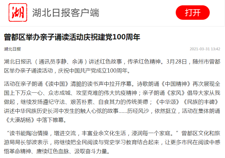 讲述红色故事,传承红色精神。3月28日,曾都区举办亲子诵读活动,庆祝中国共产党成立100周年。