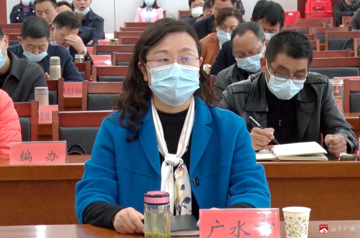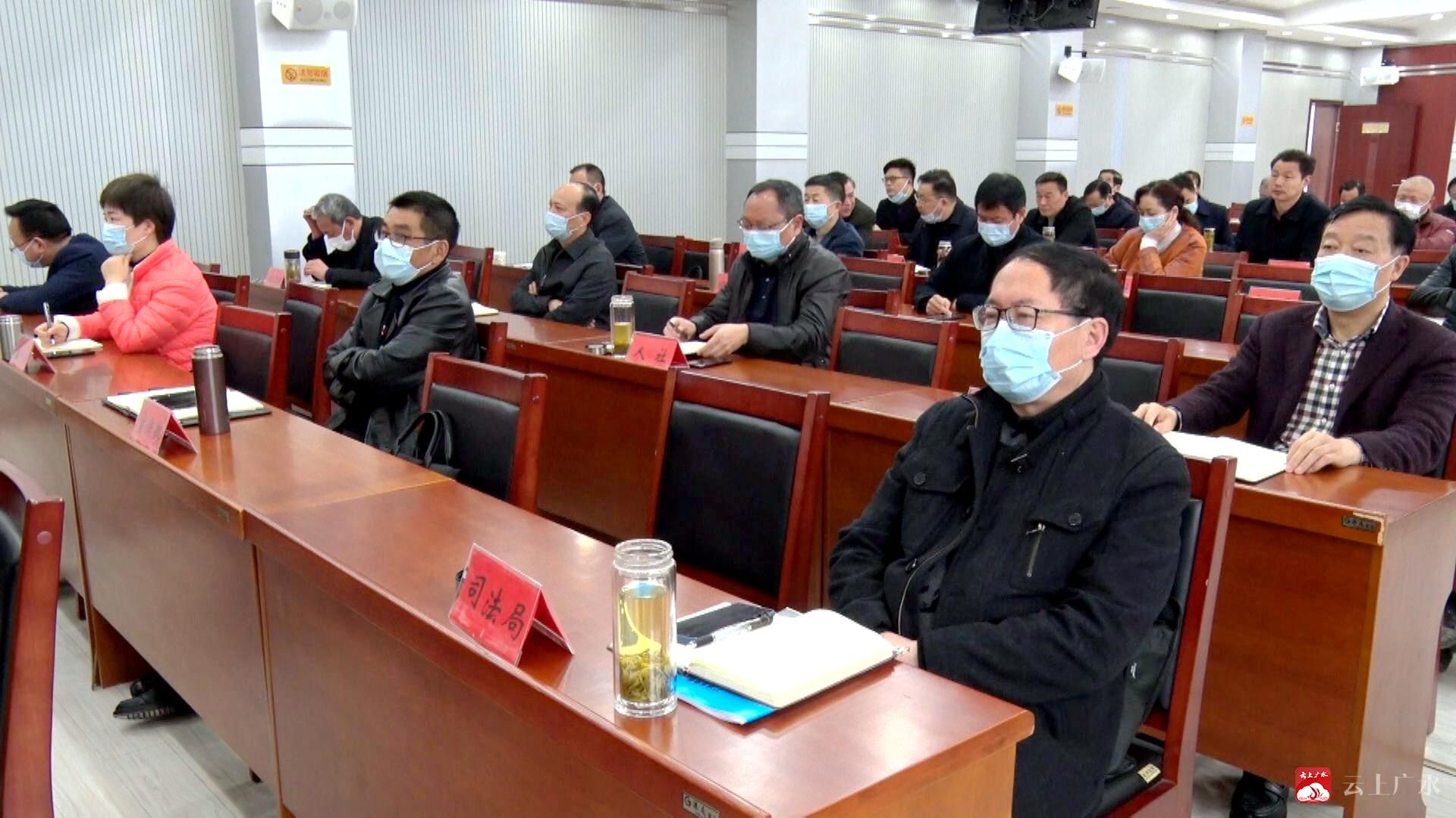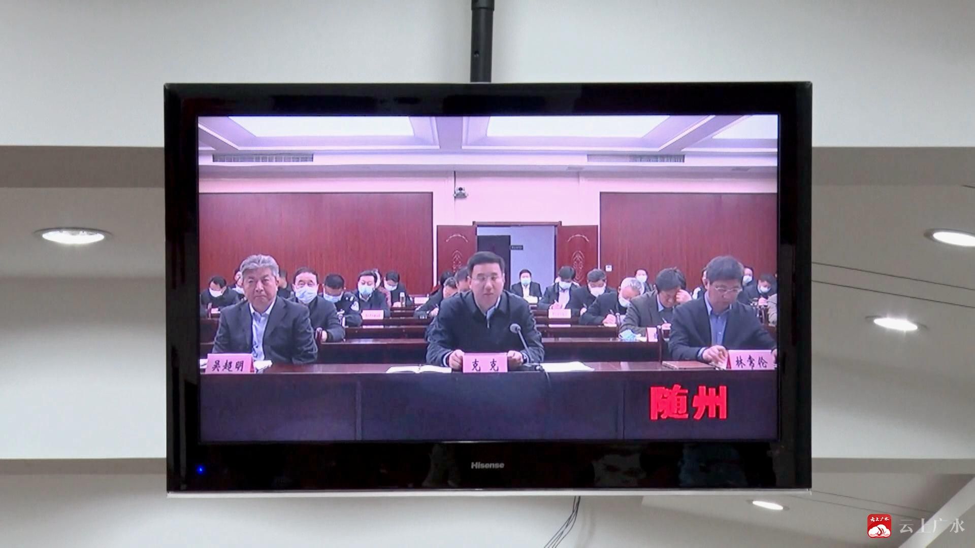 广水市长杨光胜、副市长王桂兰在广水分会场收听收看视频会。