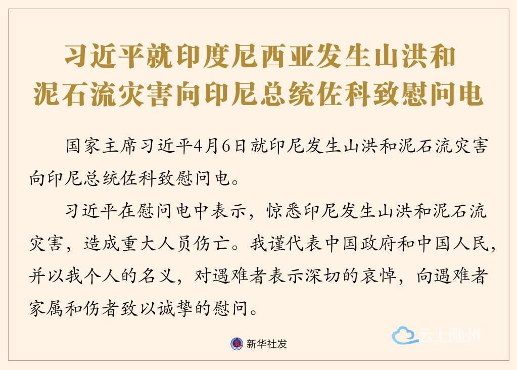 国家主席习近平4月6日就印尼发生山洪和泥石流灾害向印尼总统佐科致慰问电。 习近平在慰问电中表示,惊悉印尼发生山洪和泥石流灾害,造成重大人员伤亡。我谨代表中国政府和中国人民,并以我个人的名义,对遇难者表示深切的哀悼,向遇难者家属和伤者致以诚挚的慰问。