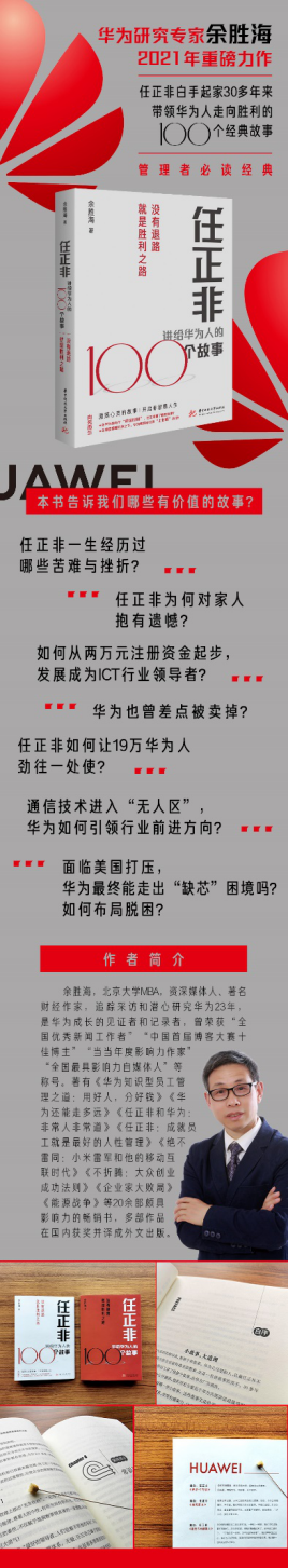 著名财经作家、华为资深研究专家余胜海先生的最新力作《任正非讲给华为人的100个故事:没有退路就是胜利之路》,4月1日由华中科技大学出版社出版。这是他推出的第5本华为系列著作。
