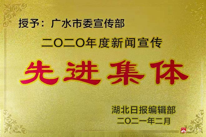 在随州市2020年基层宣传工作述职评议中,广水市在各县市区排名第一;广水市委宣传部被《湖北日报》社评为2020年度新闻宣传先进集体。