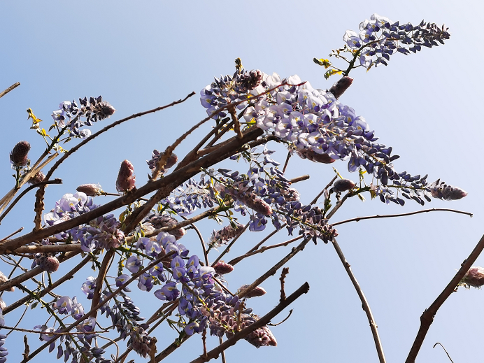 远远望去,仿若一串串熟透了的葡萄,晶莹剔透,更像一片片紫色的云霞,美轮美奂;临近驻足,一道道紫色的瀑布从上倾流而下,花瓣在阳光的沐浴下相偎在藤萝里,说着软语情话,相知相伴的喜悦泛开,飘飘洒洒。