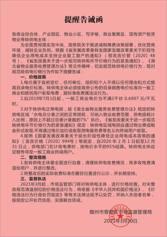 该局发放《转供电价格政策提醒告诫函》1000余份,提醒转供电企业自觉遵守价格政策,积极整改,清退多收电费,对拒不整改清退的,将立案查处。