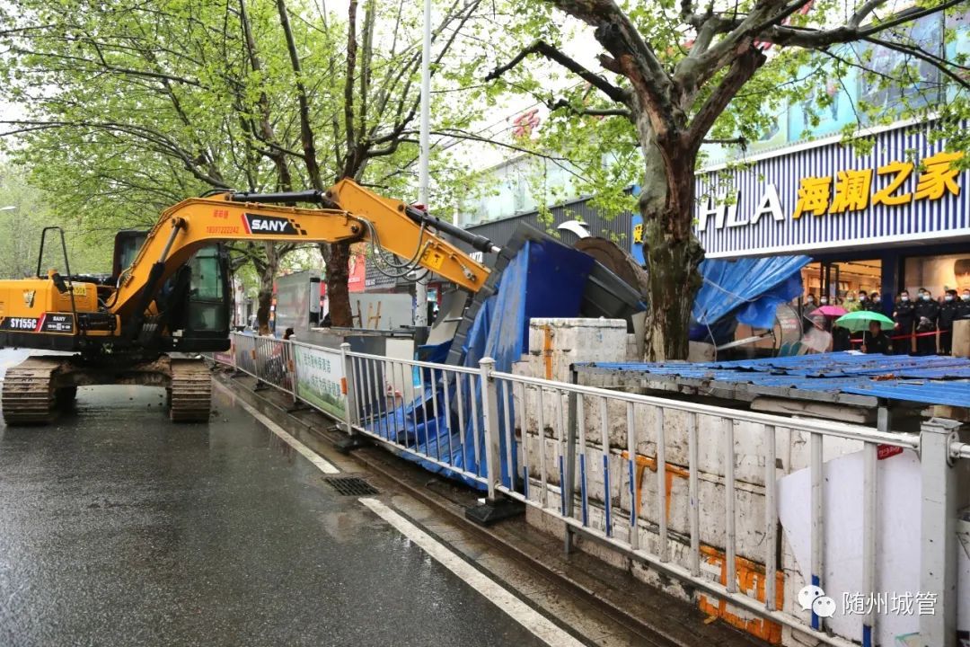 4月7日上午,随州市区城管执法部门联合东城街道办事处,组织100余名执法人员和工作人员,动用挖机等大型机械设备,依法对城区解放路中段的一处违法建筑予以强制拆除。