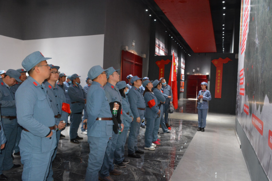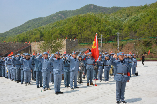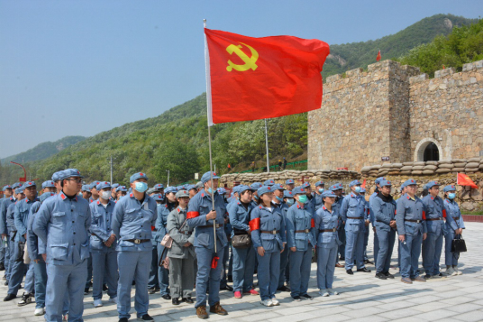 学员们在鲜红的党旗引领下,来到田王寨长征国家文化公园。他们换上红军服、戴上红军帽,列队进入红军纪念馆。