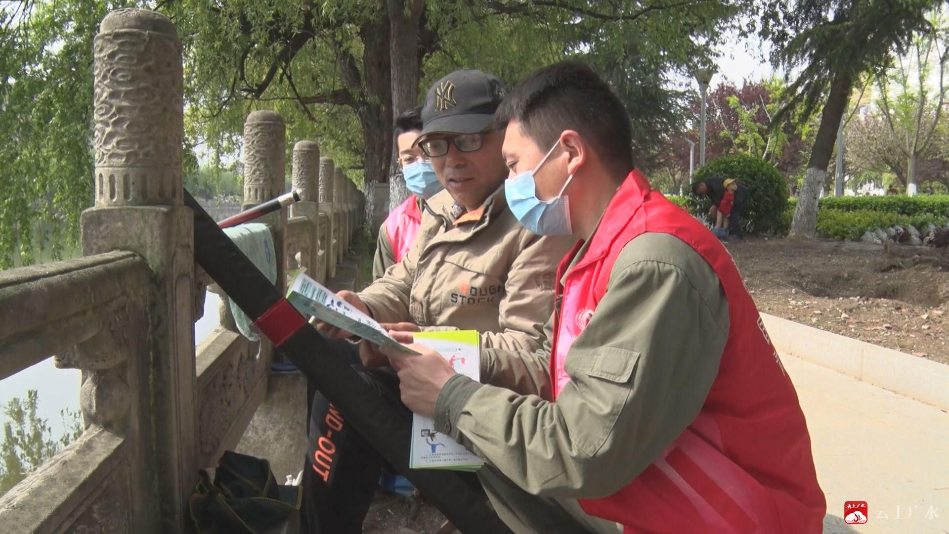 (同期声)供电公司青年志愿服务队员:这是我们的一个宣传册,上面介绍了禁止在高压线下钓鱼,还有触电的紧急救援步骤。以后请您在渔具店向买渔具的顾客推荐一下,把这个帮我们分发下。