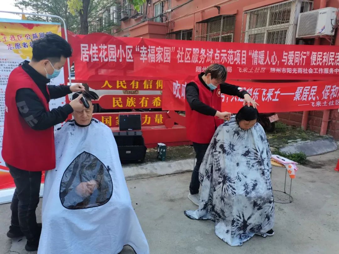 4月9日,西城街道飞来土社区在居佳花园小区举办“情暖人心,与爱同行”便民利民服务活动。活动现场,志愿者们为居民提供免费理发,免费测量血糖、血压和医疗咨询等服务。(杨思乡)