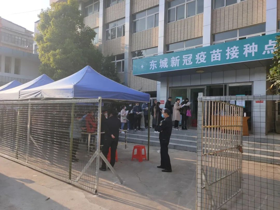 在东城新冠病毒疫苗接种点,社区安排工作人员维持现场秩序,推动疫苗接种有条不紊、井然有序开展。(周琼颜)