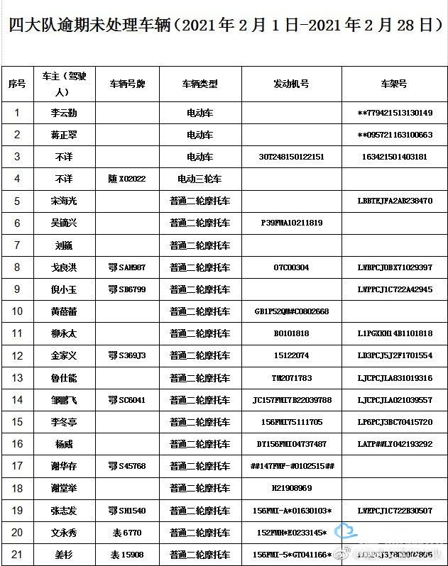 1、以下车辆在2021年02月01日至2021年02月28日期间因涉及道路交通违法,已被公安交通管理部门依法扣留,其驾驶人,所有人和管理人均未按规定期限到公安交通管理部门接受处理。根据《中华人民共和国道路交通安全法》第一百一十二条《中华人民共和国道路交通安全法实施条例》第一百零七条等相关法律法规的规定,现予以公告。自本公告发布之日起经过三个月,当事人仍不前来接受处理的,公安交通管理部门将对扣留的车辆依法处理。
