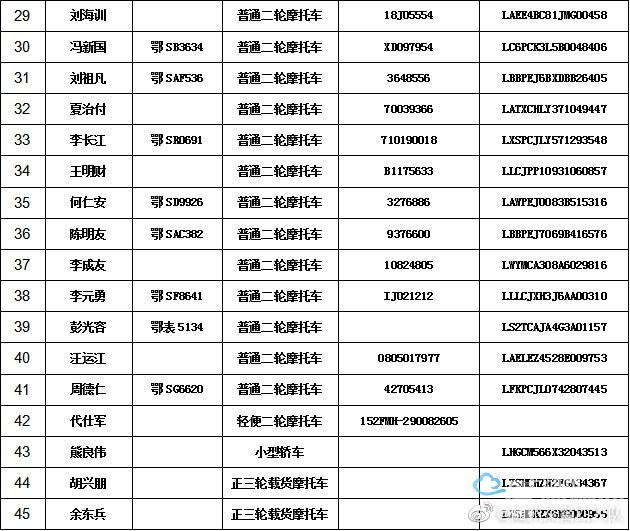 2、请以下车辆的驾驶人、所有人或管理人在本公告发布之日起三个月内携带身份证,驾驶证,行驶证或车辆合法来源证明到随州市公安局交通警察支队四大队接受处理。
