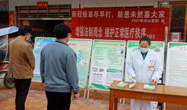 4月15日上午,随县洪山医院以第六个国家安全教育日暨第三十三个爱国卫生月为契机,在接种门诊门口放置宣传展板,向过往群众宣传讲解《中华人民共和国药品管理法》《中华人民共和国执业医师法》《关于严厉打击“三堵、五闹”违法犯罪行为的通告》《关于做好维护医疗秩序工作的通知》《中华人民共和国食品安全法》《文明健康 绿色环保生活方式手册》等医疗卫生法律法规知识。活动现场,还采取悬挂宣传横幅、设置咨询台、发放宣传资料、解答群众问题等形式,贴近群众开展宣传咨询活动,围绕人们关心关注的疫情防控、就医安全、打击非法行医等难点热点问题认真进行了宣传讲解,指导大家如何正确安全就医、如何养成良好的卫生习惯等。现场解答卫生法律和卫生知识咨询,营造了良好的国家安全和公共安全人人有责的法治宣传氛围。此次活动,共发放宣传手册及资料150余份,提供咨询服务40余人次。通过活动,增强了群众对医疗卫生和相关法律知识的了解,取得了良好的宣传效果。(赵杨、陈传兵、张永姿、周吴希)