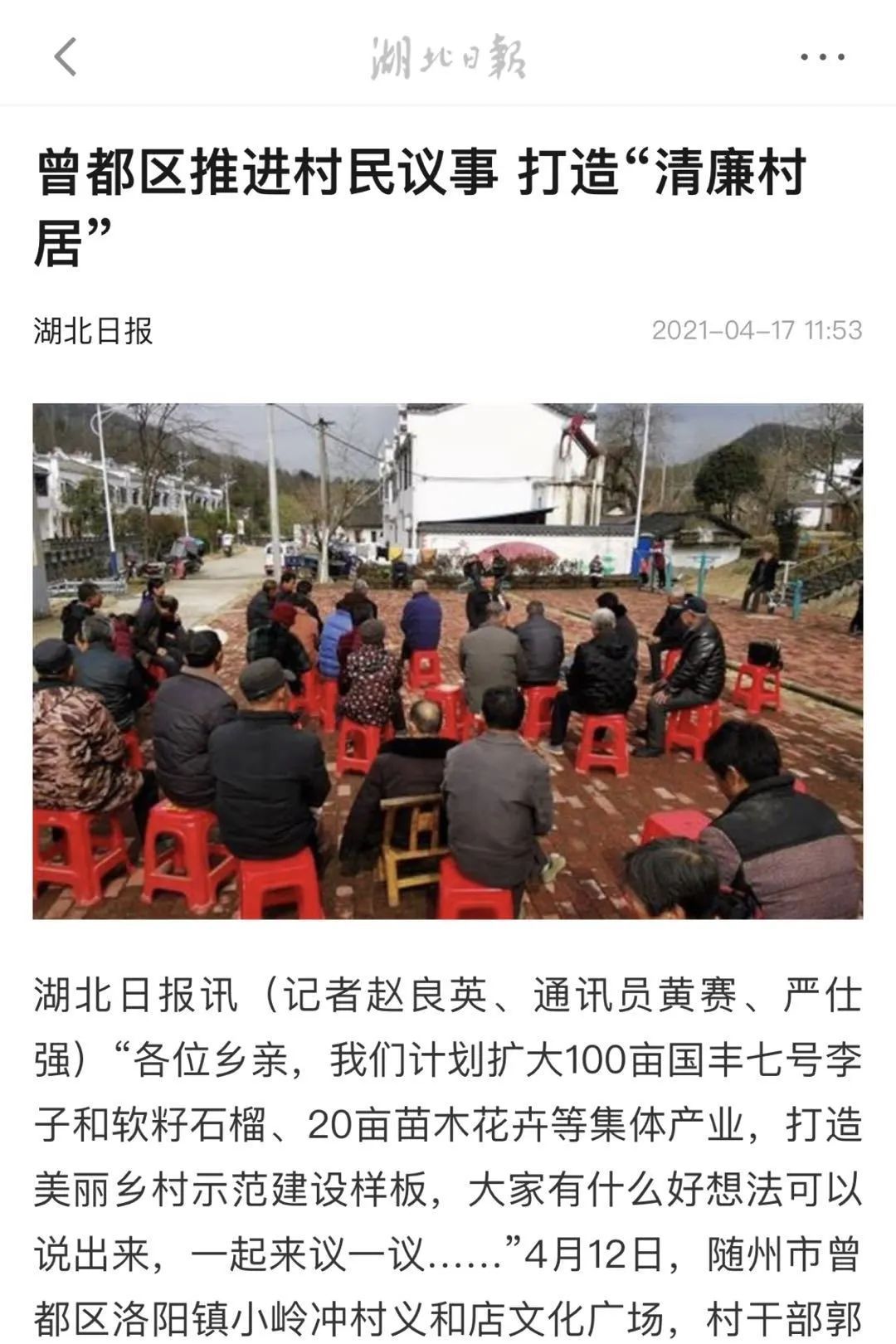 “各位乡亲,我们计划扩大100亩国丰七号李子和软籽石榴、20亩苗木花卉等集体产业,打造美丽乡村示范建设样板,大家有什么好想法可以说出来,一起来议一议……”4月12日,随州市曾都区洛阳镇小岭冲村义和店文化广场,村干部郭远雄和村民代表聚在一起举行村民议事会,讨论小岭冲村当前重点工作。