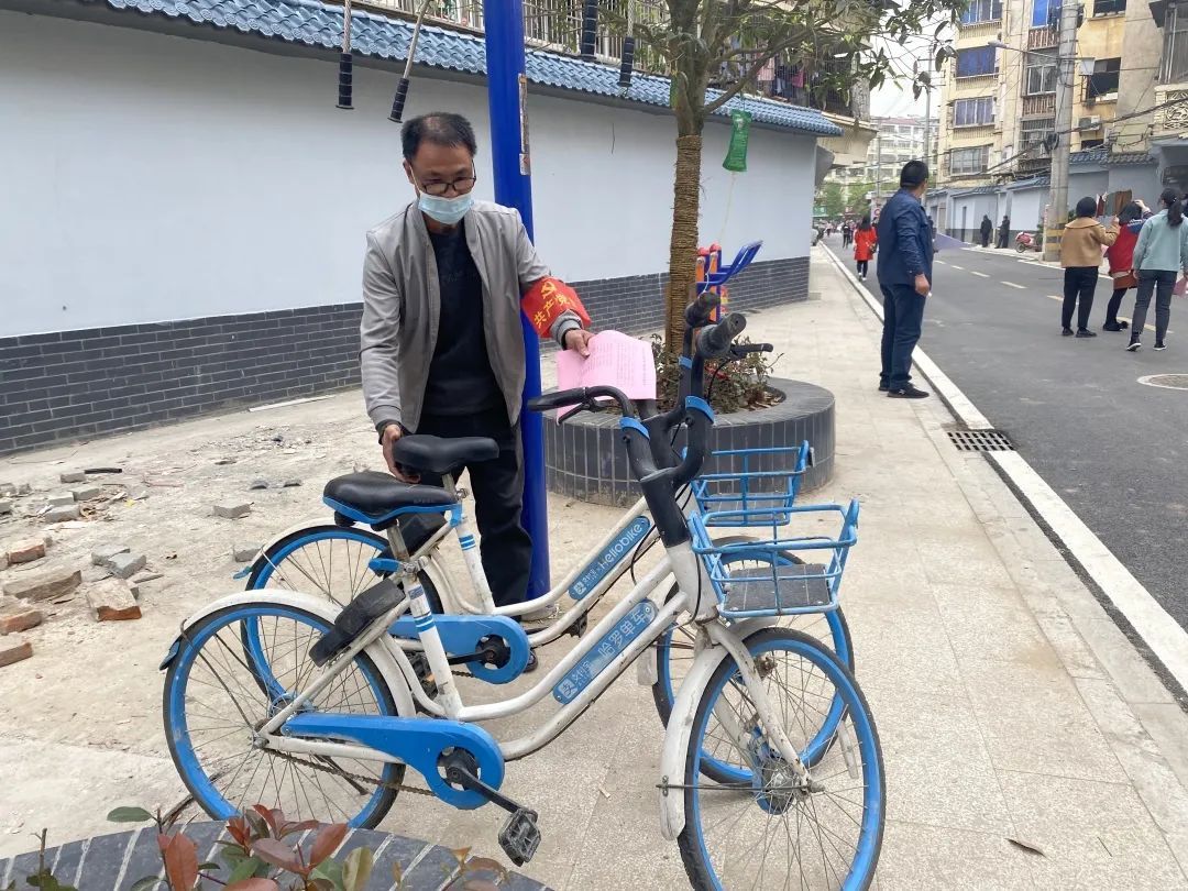 通津桥社区新时代文明实践站组织下沉单位、爱心志愿者及社区工作者在辖区开展文明劝导活动,对乱停放的共享车辆进行有序摆放。