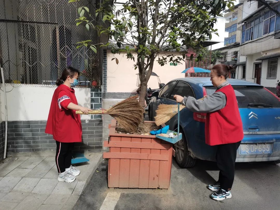 草店子社区新时代文明实践站组织下沉党员干部及志愿者对辖区内的环境卫生进行集中清理,并入户走访慰问困难家庭。