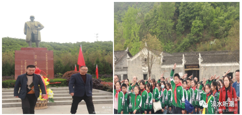 九口堰村新四军第五师司令部,原是建于清朝的民居“孙家大院”,依山伴水,翘角飞檐,灰墙黛瓦,十分宁静清幽。 万里纵横英魂在,今朝不负盛世情。在纪念馆广场上,巍然屹立的李先念铜像深情地凝望着这片热血土地。全体师生们怀着崇敬之情,敬献花篮,少先队员们重温少先队誓词并宣誓!