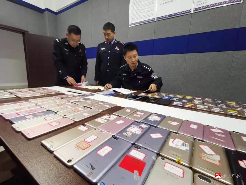 图为民警清点查扣手机等物品
