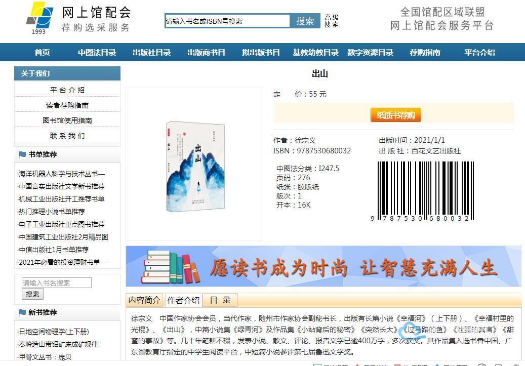 第34届北京图书订货会于3月31日——4月2日在中国国际展览中心(老馆)举办,随州作家徐宗义创作的长篇小说《出山》在中国国际展览中心6号展区亮相。