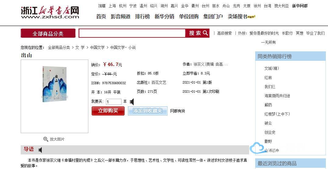 据悉,《出山》是作家徐宗义继《幸福村里的光棍》之后,历时两年创作的又一部长篇力作,由百花文艺出版社公开出版发行,于思想性、艺术性、文学性、可读性浑然一体。记者网上搜索发现,中国图书网、蔚蓝网、文轩网、京东、天猫、当当网、全国馆配区域联盟网上馆配会服务平台、浙江新华书店网等均在销售。 此书的公开出版发行,对随州文学创作走出去起到了助力与鼓劲的作用。