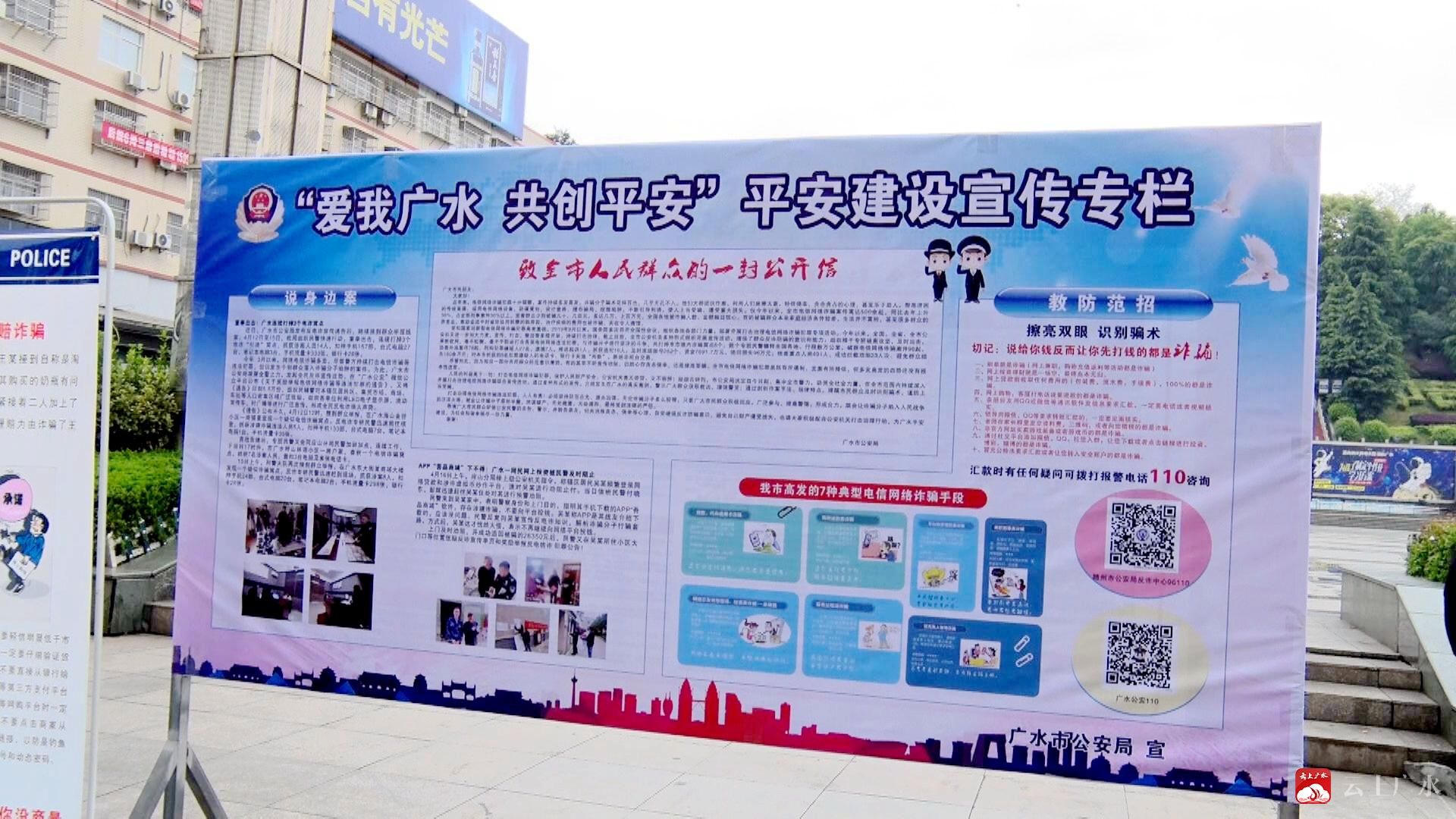 在应山城区东大街和印台广场,广水市公安局、市人民法院、市人民检察院、市司法局、市人社局、市教育局等部门设立宣传咨询台,张贴横幅标语,发放宣传资料,接受群众咨询,以通俗易懂、群众乐于接受的生动形式,宣传习近平总书记关于平安中国建设的重要论述和广水市委深化平安建设的决策部署,宣传全省综治“四项指标”测评工作的内容和方式方法,宣传各地各部门深入推进扫黑除恶专项斗争、严惩黑恶犯罪、规范执法司法行为、优化营商环境的工作动态,宣传防盗、防抢、防骗、防火、防事故知识等各类同群众利益关系密切的安全防范知识。