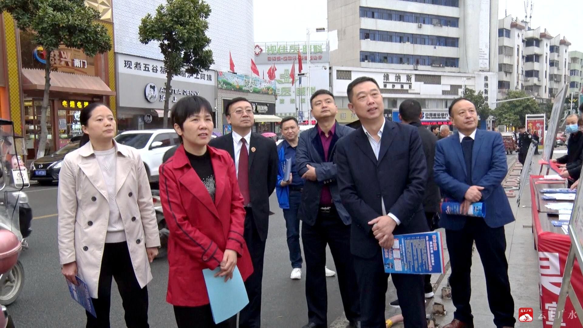 广水市委副书记刘秀玲、市委常委、政法委书记刘晓界、副市长、市公安局长张亮、市人民法院院长张珍、市人民检察院检察长曹永胜到宣传咨询台前,看望工作人员,检查指导平安广水建设组织开展工作。