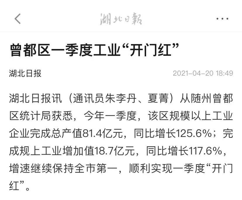 从随州曾都区统计局获悉,今年一季度,该区规模以上工业企业完成总产值81.4亿元,同比增长125.6%;完成规上工业增加值18.7亿元,同比增长117.6%,增速继续保持全市第一,顺利实现一季度“开门红”。