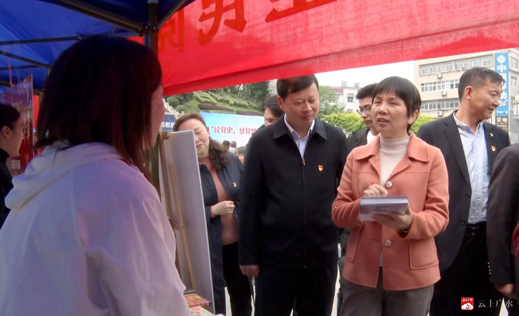 刘秀玲、梁晗鹍、刘曦东还与现场群众一起参观大众文化图书展、现场签名购书赠书、数字阅读推广、非遗展示宣传活动。市新华书店、市图书馆、市作家协会等单位共同推出了图书集市,展示广水本土文化的书籍作品刊物,深受市民群众欢迎。