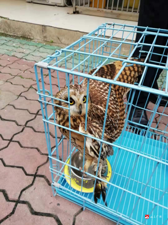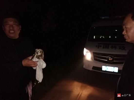 4月23日 ,广水市林政稽查大队成功救助一只受伤的国家二级保护野生动物----雕鸮。